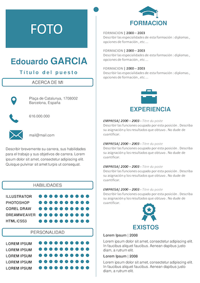 El CV presentado aquí es bastante clásico por su gama de colores (blanco y beige) y su presentación general. Así, subraya tu seriedad y constituye una solicitud de empleo que pone en valor tu personalidad. Como este modelo pone el acento en la parte superior de la página dedicada a la formación, es particularmente apropiado si todavía estás estudiando. Una sección dedicada a tu experiencia laboral te permite, no obstante, tratar de describir las prácticas o actividades relacionadas que hayas hecho. Por tanto, recomendamos utilizar este currículum vitae si eres un joven graduado o si buscas prácticas de fin de estudios o una formación en alternancia.